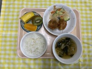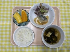 今日のメニューは、〇ご飯 〇さばの味噌煮 〇きゃべつのゆかり和え 〇すまし汁 〇選べるフルーツです。