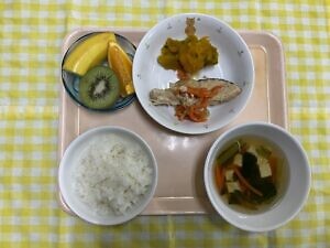今日のメニューは、〇ご飯 〇鮭のちゃんちゃん焼き 〇かぼちゃの煮物 〇豆腐のすまし汁 〇選べるフルーツです。