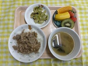 今日のメニューは、〇豚丼 〇塩こんぶキャベツ 〇みそ汁 〇選べるフルーツです。