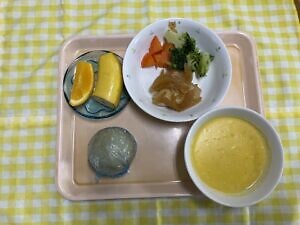 今日のメニューは、〇ロールパン 〇チキンステーキ 〇野菜のグラッセ 〇かぼちゃのポタージュ 〇選べるフルーツです。