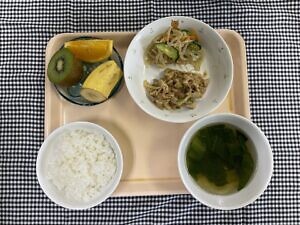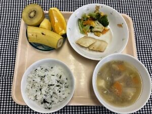 今日のメニューは、〇わかめご飯 〇魚の煮つけ 〇ブロッコリーサラダ 〇豚汁 〇選べるフルーツです。