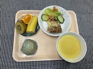 今日のメニューは、〇ロールパン 〇チーズハンバーグ 〇野菜サラダ 〇かぼちゃのポタージュ 〇選べるフルーツです。」