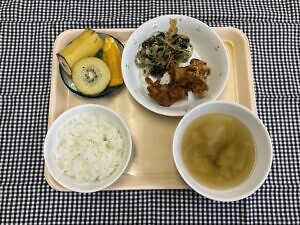 今日のメニューは、〇ご飯 〇鶏の唐揚げ 〇ほうれん草の磯和え 〇みそ汁 〇選べるフルーツです。