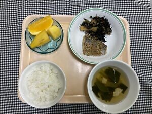 今日のメニューは、〇ご飯 〇さわらのごま照り焼き 〇豆腐のすまし汁 〇ひじきの煮物 〇選べるフルーツです。