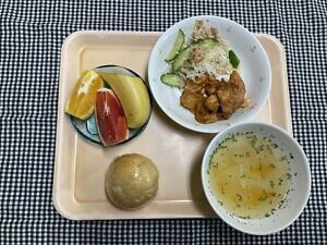 今日のメニューは、〇ご飯 〇鶏肉のごま味噌焼 〇かぼちゃサラダ 〇すまし汁 〇選べるフルーツです。
