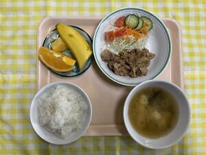 今日のメニューは、〇ご飯 〇豚肉のしょうが焼き 〇せんキャベツ 〇みそ汁 〇選べるフルーツです。