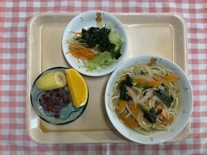 今日のメニューは、〇和風スープスパゲティ 〇野菜サラダ 〇選べるフルーツです。