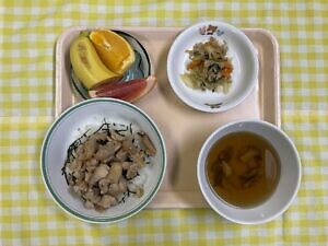 今日のメニューは、〇鶏の梅風味丼 〇小松菜とツナの炒め物 〇きのこ汁 〇選べるフルーツです。