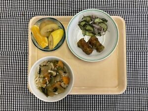 今日のメニューは、〇うどん 〇ちくわの磯辺揚げ 〇ゆかり和え 〇選べるフルーツです。