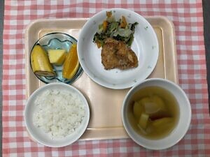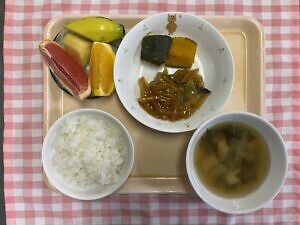 今日のメニューは、〇ご飯 〇さわらの甘酢あんかけ 〇かぼちゃの煮物 〇みそ汁 〇選べるフルーツです。