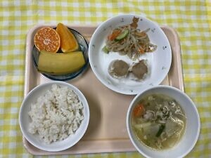 今日のメニューは、〇ご飯 〇シュウマイ 〇野菜の中華和え 〇ワンタンスープ 〇選べるフルーツです。