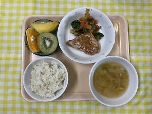 今日のメニューは、〇ご飯 〇ばさの竜田揚げ 〇ブロッコリーおかか和え 〇選べるフルーツです。